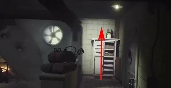 5、厨子离开后下去,如下图箭头所指,钥匙就挂在这里,爬上去,AD摇晃将其弄下来,抱着钥匙进入电梯吧。最后,拿着钥匙开门就行了。