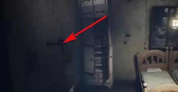 2、走到最右边的房间可以发现这里的门被锁住了,沿着柜子往上爬,然后从房梁上走。