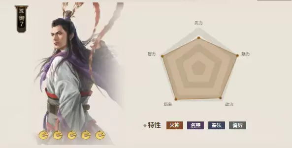 免伤提升6%~12%。敌军对自己造成伤害会获得一层【复仇】,持续5回合,可叠加6层。造成主动伤害后消耗目标2层【复仇】(单体伤害则为4层),友军伤害则消耗一半层数。每层【复仇】造成32%~64%谋略伤害,且恢复伤害量15%~30%兵力。