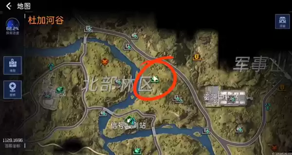 1、玩家需要先打开地图来到北部林区,在如图所示的位置可以看到一个信号塔,靠近即可接取任务。