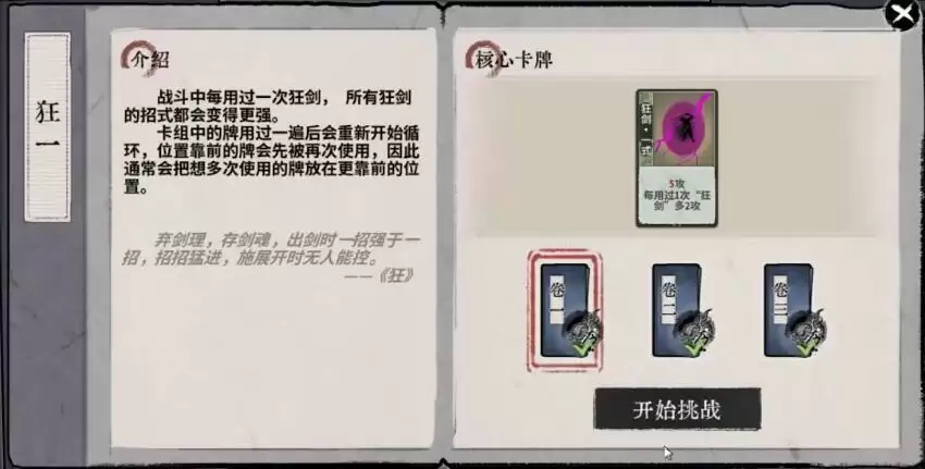 4、进入卷三开启挑战,将卡牌按照神力丹—狂剑·零式—狂剑·二式—云剑·游龙—云剑·月影—云剑·闪风—狂剑·二式—狂剑·一式的顺序摆放,完成战斗。