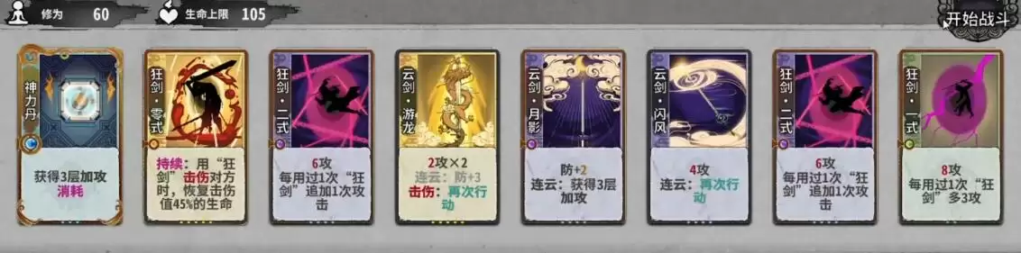2、将卡牌按照狂剑·一式—狂剑·一式—狂剑·一式—云剑·探云—云剑·回守—云剑·回守—云剑·汇灵—云剑·汇灵的顺序摆放,完成战斗。
