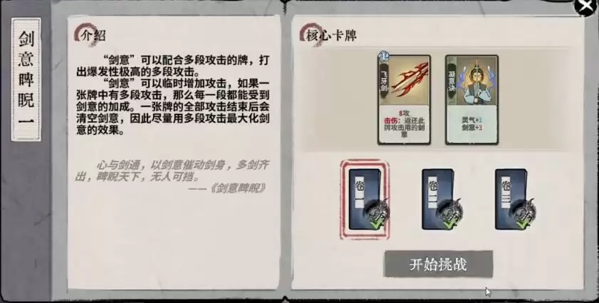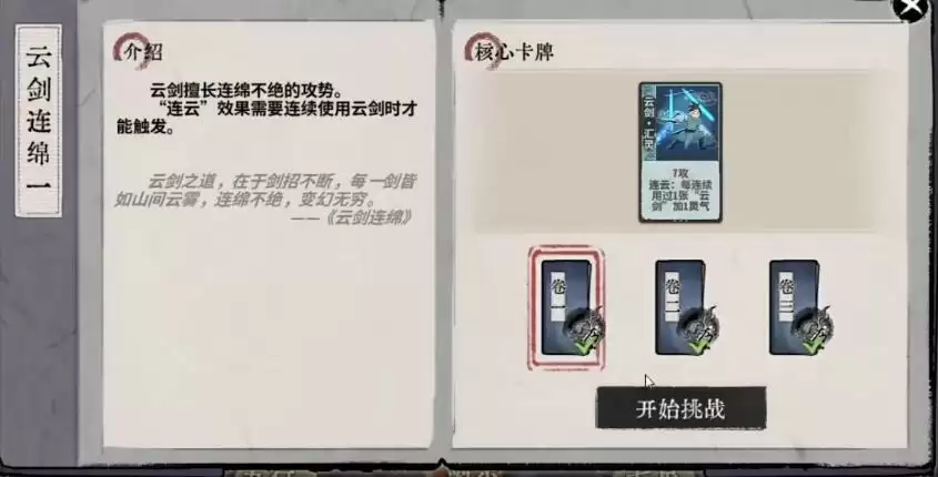 4、进入卷三开启挑战,将卡牌按照神力丹—狂剑·零式—狂剑·二式—云剑·游龙—云剑·月影—云剑·闪风—狂剑·二式—狂剑·一式的顺序摆放,完成战斗。