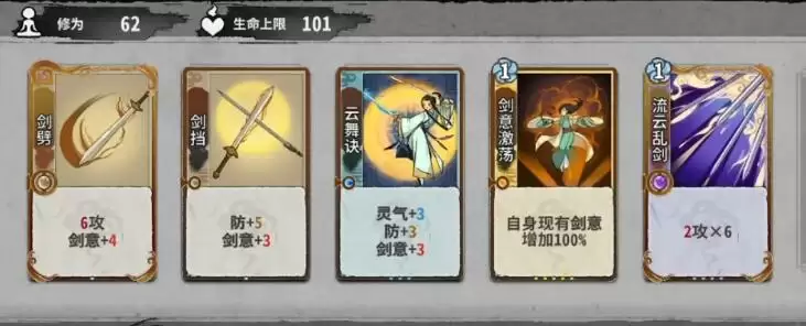 4、进入卷三,按照剑劈—剑挡—云舞诀—剑意激荡—流云乱剑的顺序摆放,其中流云乱剑将叠加云泉道茶和流云乱剑,完成战斗。