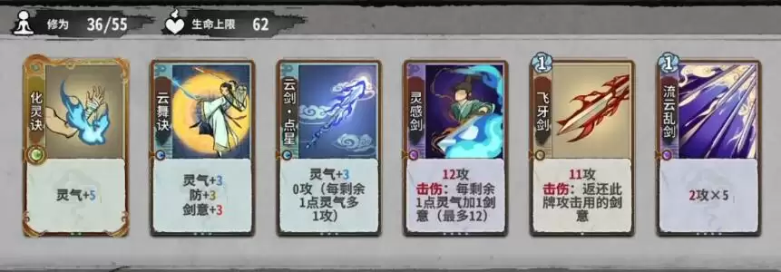 2、将卡牌按照剑劈—剑挡—凝意诀—凝意诀—飞牙剑—飞牙剑—三峰剑的顺序摆放,完成战斗。