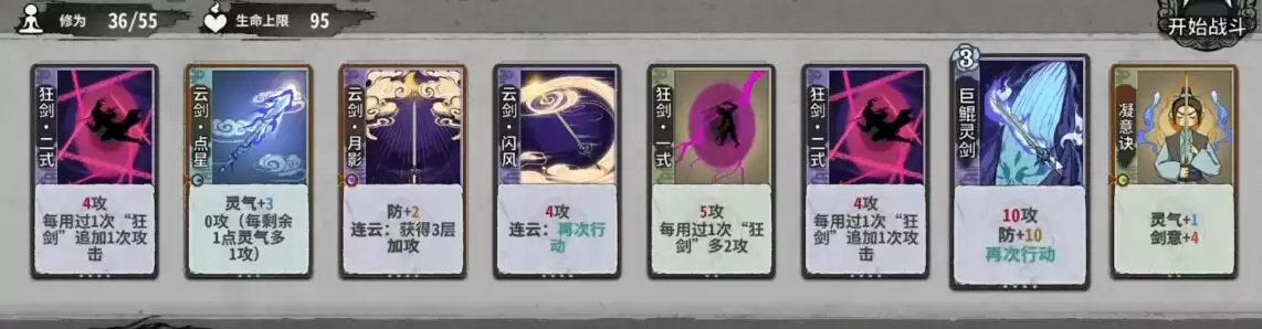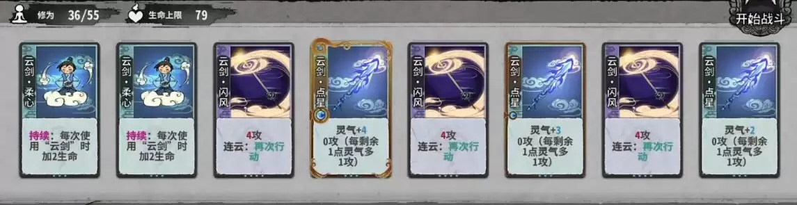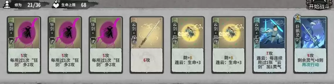 2、将卡牌按照狂剑·一式—狂剑·一式—狂剑·一式—云剑·探云—云剑·回守—云剑·回守—云剑·汇灵—云剑·汇灵的顺序摆放,完成战斗。