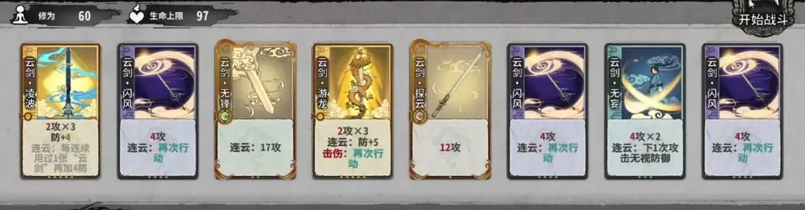 4、进入卷三,将卡牌按照云剑·凌波—云剑·闪风—云剑·无锋—云剑·游龙—云剑·探云—云剑·闪风—云剑·无妄—云剑·闪风的顺序摆放,完成战斗。