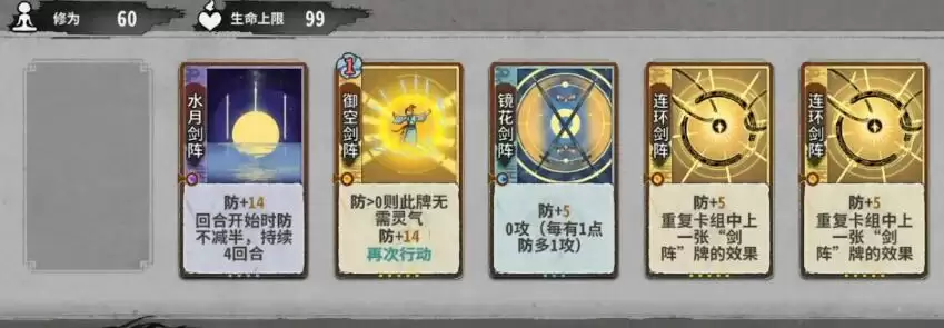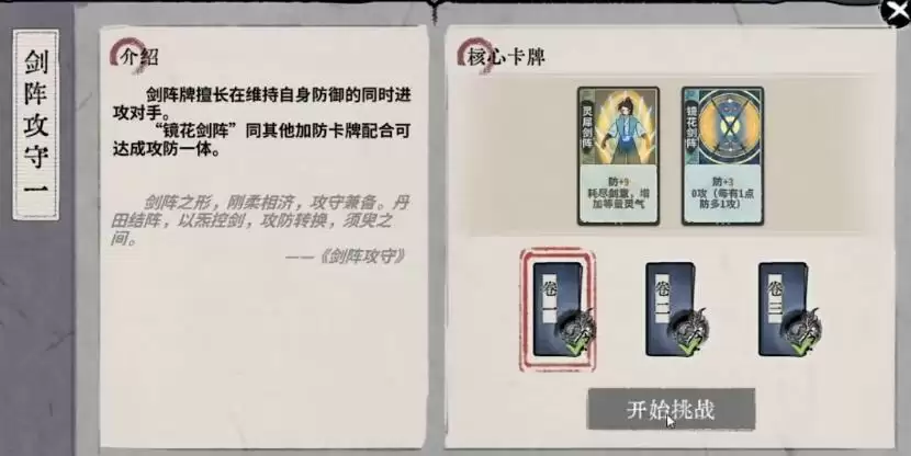 4、进入卷三开启挑战,将卡牌按照空一格—水月剑阵—御空剑阵—镜花剑阵—连环剑阵—连环剑阵的顺序摆放,完成战斗。