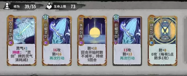 3、进入卷二开启挑战,将相同的卡牌都合成,按照百鸟灵剑诀—巨鲲灵剑—水月剑阵—巨鲲灵剑—镜花剑阵的顺序摆放,完成战斗。