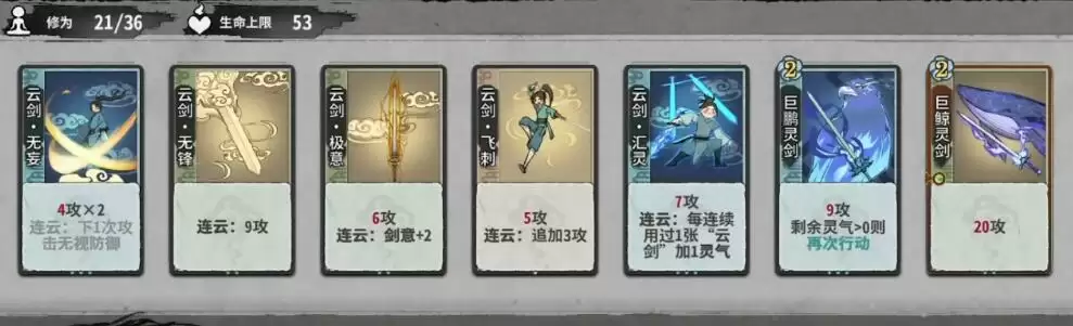 4、进入卷三,将卡牌按照云剑·凌波—云剑·闪风—云剑·无锋—云剑·游龙—云剑·探云—云剑·闪风—云剑·无妄—云剑·闪风的顺序摆放,完成战斗。