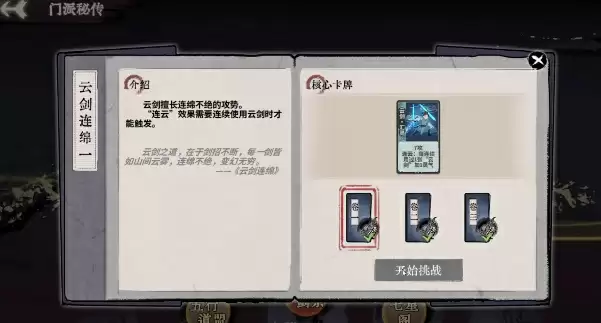 1、选择进入门派秘传,找到云剑连绵卷一开始挑战。
