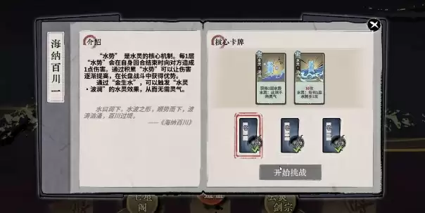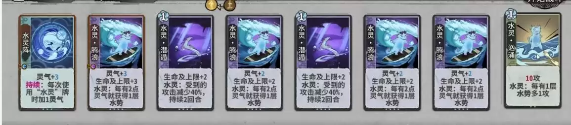 4、进入卷三开启挑战,将卡牌按照水灵阵(升1级)—水灵·腾浪(升1级)—水灵·潜遁—水灵·纳百川—水灵·腾浪—水灵·纳百川—水灵·泉涌—水灵·汹涌的顺序摆放,完成战斗。