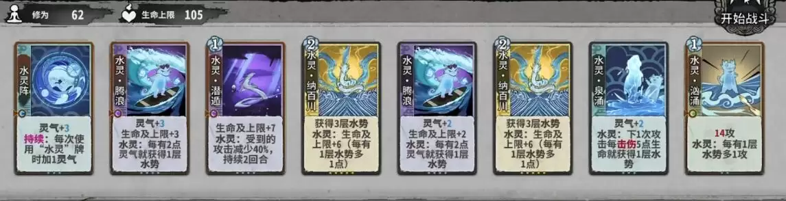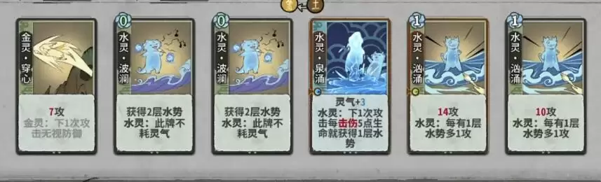 2、将卡牌按照金灵·穿心—水灵·波澜—水灵·波澜—水灵·泉涌—水灵·汹涌—水灵·汹涌的顺序摆放,完成战斗。