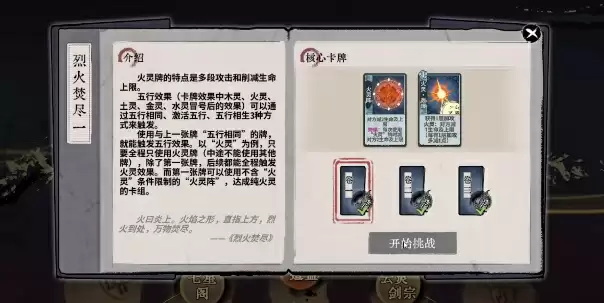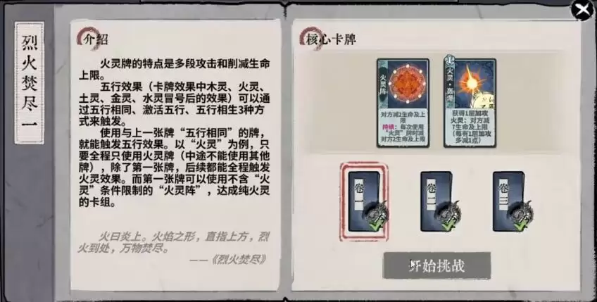 4、进入卷三开启挑战,将卡牌按照火灵阵—火灵阵—火灵·瞬燃—火灵·聚炎(升1级)—火灵·瞬燃—火灵·轰爆(升1级)—火灵·瞬燃—火灵·烈燎原,的顺序摆放,完成战斗。