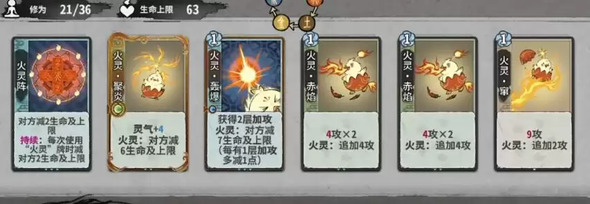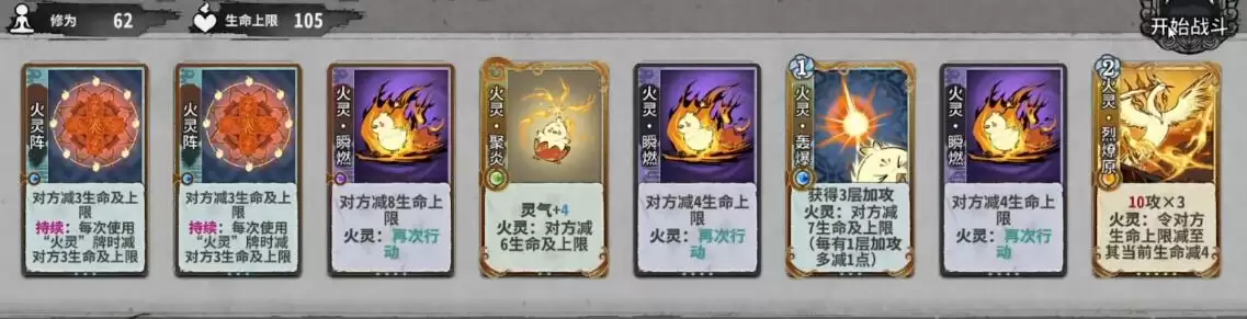 2、将卡牌按照火灵阵—火灵·聚炎—火灵·轰爆—火灵·赤焰—火灵·赤焰—火灵·窜的顺序摆放,完成战斗。