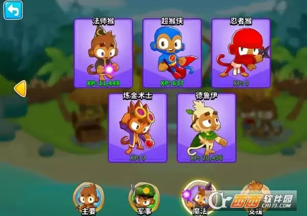 1、猴子分为4个大类别,初级、军事、魔法、支援,这四个分类也有对应的四大类知识(详细查看第六条目),常规模式可以放置任意猴子,通关常规模式后的条件分支指定类别后,只能使用单类别内的猴子。