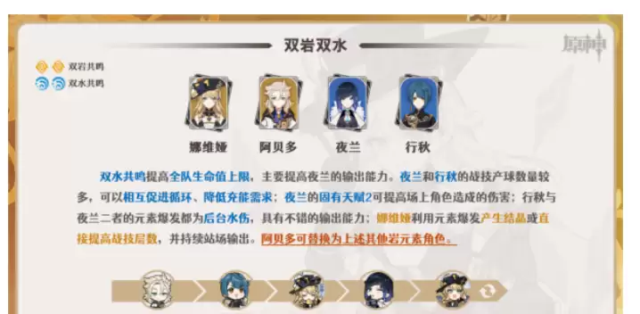 双水共鸣提高全队生命值上限,主要提高夜兰的输出能力。夜兰和行秋的战技产球数量较多,可以相互促进循环、降低充能需求;夜兰的固有天赋2可提高场上角色造成的伤害;行秋与夜兰二者的元素爆发都为后台水伤,具有不错的输出能力;娜维娅利用元素爆发产生结晶或直接提高战技层数,并持续站场输出。下阿贝多可替换为上述其他岩元素角色。