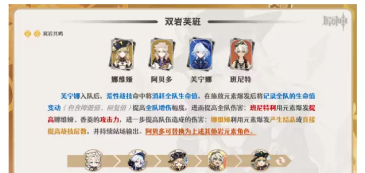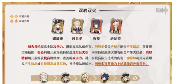 双火共鸣提高全队攻击力,进而提高队伍伤害。阿贝多负责产球并配合产生结晶,优化娜维娅技能;香菱利用元素爆发持续造成后台火伤,同时持续施加火附着配合产生火结晶;班尼特利用元素爆发提高娜维娅、香菱的攻击力,进一步提高队伍造成的伤害;娜维娅利用元素爆发产生结晶或直接提高战技层数,并持续站场输出。阿贝多可替换为上述其他岩元素角色。