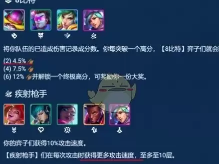 凯特琳是8比特与疾射枪手羁绊,8比特羁绊能为比特棋子提供攻击力,而疾射枪手羁绊能为队伍增加10%的攻速,关键的是疾射枪手棋子每次普攻提供4%的攻速加成,最高可叠加10次(40%攻速),这样凯特琳普攻技能释放频率均能大幅度加快。
