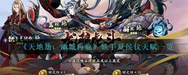 天地劫幽城再临即将开启限时精选龙骧虎斗,很多小伙伴都很想知道其中铁手夏侯仪的天赋是什么,今天小编给大家带来了《天地劫:幽城再临》铁手夏侯仪天赋一览。感兴趣的小伙伴一起来看看吧。