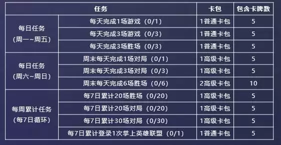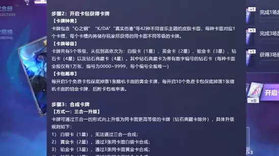 完成每日活跃、每周活跃等任务即可领取普通卡包或高级卡包,每个卡包开启后将掉落5张卡牌(阶段任务见附录)。其中每开启5个普通卡包将掉落1张黄金卡牌,每开启10个普通卡包掉落1张铂金卡牌。