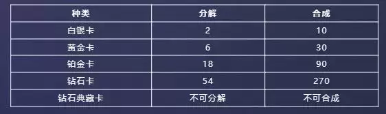 每张卡牌可被分解成数量不同的卡牌碎片,并用于合成指定等级的卡面(钻石典藏卡除外),合成及分解的碎片数量。