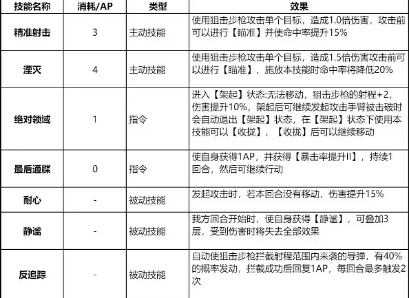 娜塔莉亚是一名擅长阵地战,并主打暴击狙射的狙击手,天赋技能“情报收集”。蹭队友的击杀,攒自己的AP,虽然天赋生效有1回合的间隔,但有时也能让我们在下一回合用上高消耗但能精准狙击的技能。