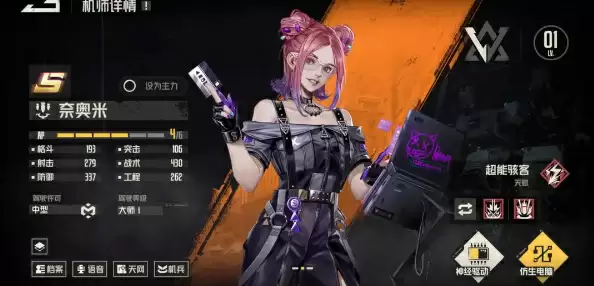 角色介绍:奈奥米是一名战术家,操作机型为中型,其天赋为“超能骇客”,可以利用双肩配备的导弹同时对目标发起攻击,同时伤害还会得到大幅度提升,是比较少见的能双导弹同时发射的战术家,超远程打击一流。
