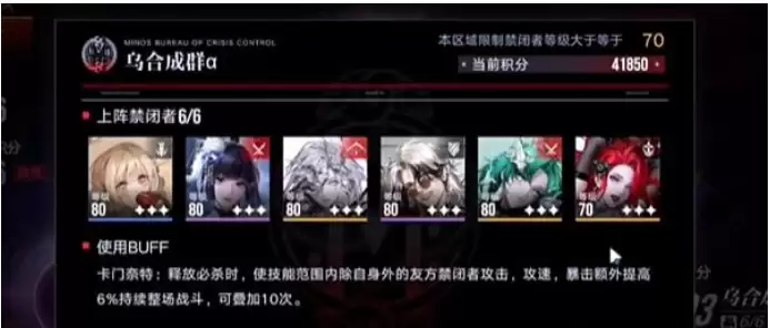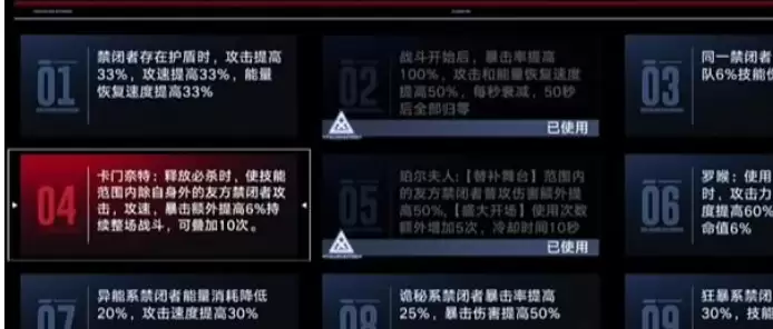 2、然后角色练度以及烙印如下,不带的是曼提斯以外的其他破合角色的话,那么携带能量套或者输出套都可以,李维没有星象流逝就正常携带能量套,如果没有逆位之裁,那么卡门正常的携能量套就可以好。