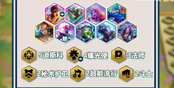 九人口羁绊:5迪斯科、4耀光使、3法师、2秘术护卫、2超能流行、2斗士。