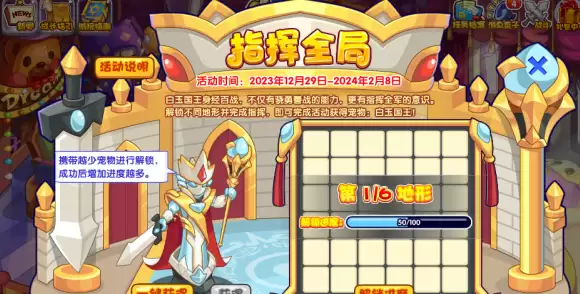 1.活动需要携带尽量少的宠物进行挑战,推荐携带1~2只宠物,战胜白玉国王就可以获得地形解锁的进度哦。