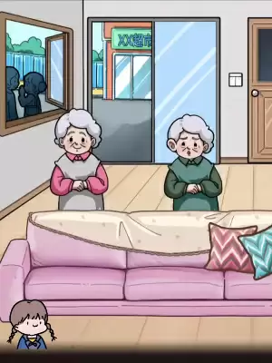2、右滑打开房门出现外卖员有老奶奶去拿奶茶外卖,上滑前排紫色衣服老奶奶上衣口袋出现手机需要出去发信息;