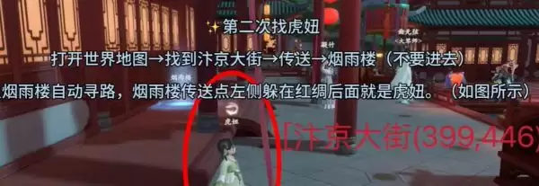 2、第二次依旧是在汴京大街,在(399,446)的位置,去到烟雨楼,在烟雨楼传送点的左侧就可以找到。