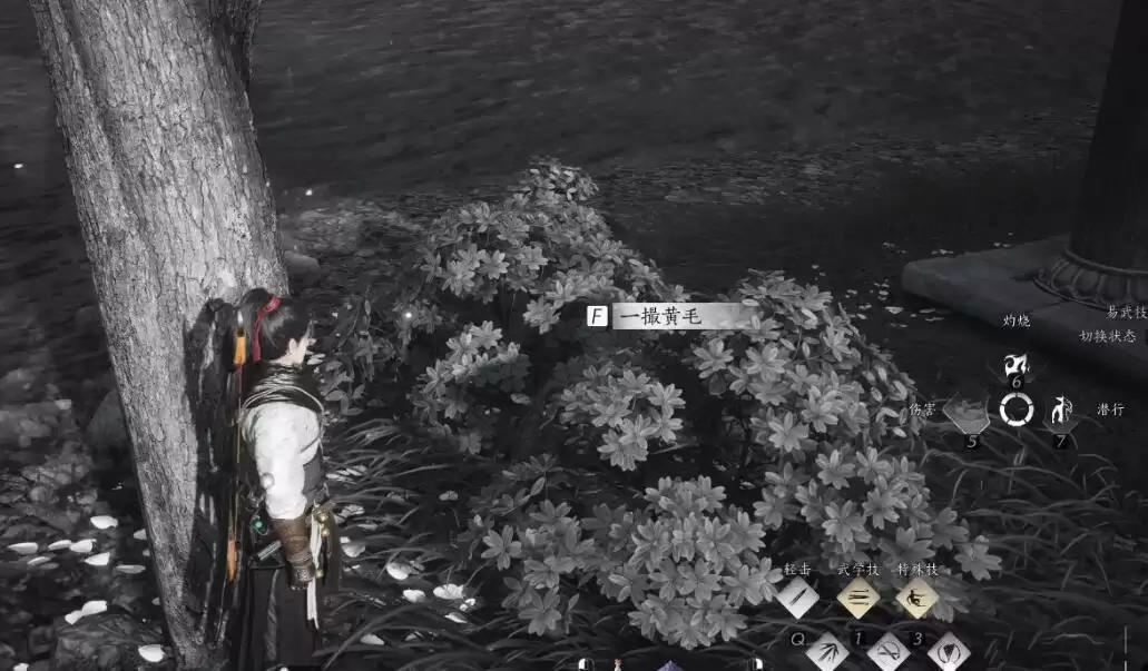 2、来到存香塔下梨花树引位置,可以找到一撮黄毛,得知是猿猴偷的酒。