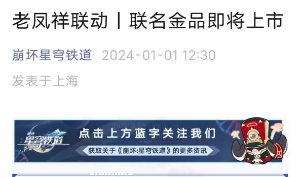 崩坏星穹铁道老凤祥联动价格是多少?崩坏星穹铁道最新在元旦节当天宣布和老凤祥联动,联名的金品即将上线,上线时间大概是1月3日左右,联动角色是仙舟罗浮的饮月君,价格大概是666元左右。