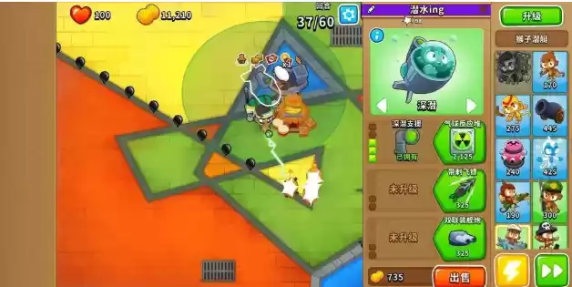 到36回合开始上浮潜艇,放掉所有绿气球。回合结束后刚好剩余100生命,然后下沉。