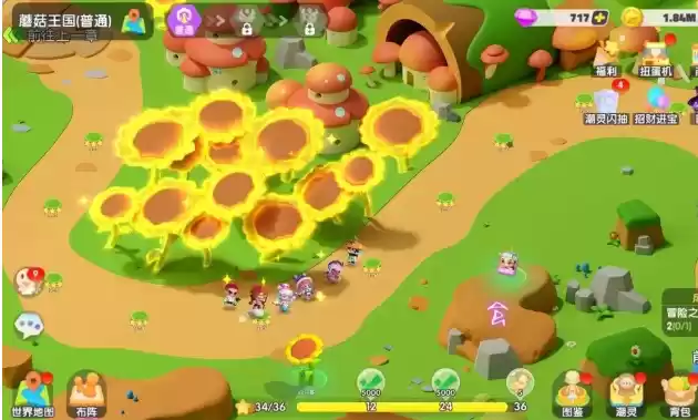 完成新手引导,潮灵们就将踏上冒险之旅,寻找王国之心。在王国的右下角,点击【冒险】即可进入冒险之旅,潮灵们将会遗忘森林中开始自己的冒险征程,通过一个地图的所有关卡即可展开下一个地图的冒险。