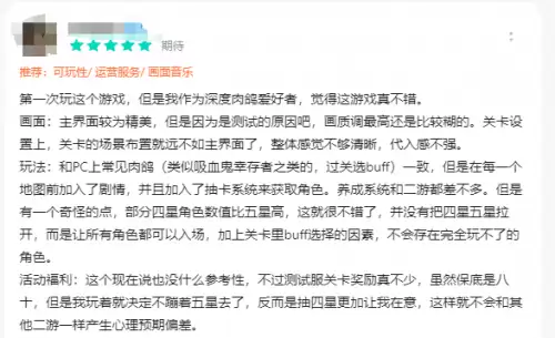 《梦游》在2023年12月1日开启了“初梦测试”,别具一格的画风和UI让人眼前一亮,游戏的整体背景比较有童话世界的味道,在肉鸽游戏中也算是一个推陈出新的点。四星角色和五星角色之间没有太大的数值差距,而在关卡内buff的加成下,几乎每个角色都可以带来不同的畅快体验。