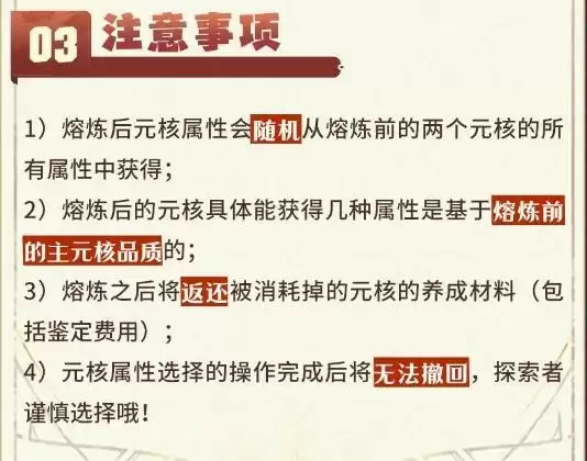 选定熔炼所需要的两个元核后,右侧会出现熔炼后元核可能出现的词条属性与宿命效果。如果有中意的属性则可以通过消耗原石将其“锁住”,在熔炼之后必定会出现该属性呦!