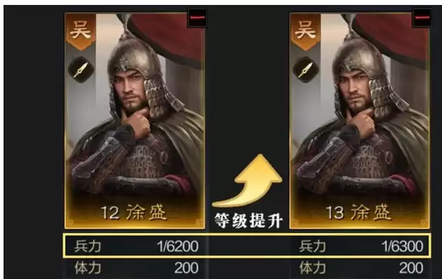 1)升级能增加武将属性值,并且每级能提升100带兵数量。