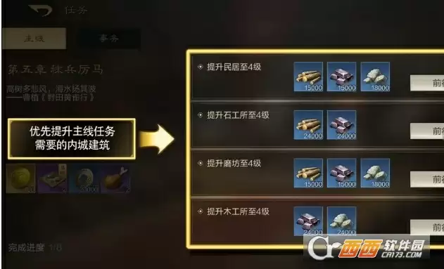 5、前期以完成主线任务为目标,因此,应综合考虑任务需求与资源投入,合理规划资源储存。在资源充足时,优先升级完成主线任务所需要的内城建筑!