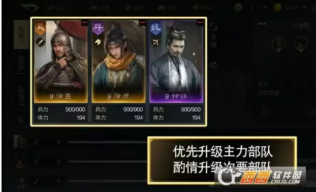 3、注重武将等级提升。前期升级武将等级至关重要,优先使用道具、铜币升级主力部队,保证阵容强度,如果开荒无压力,也可以酌情培养二队,以加快发育速度。