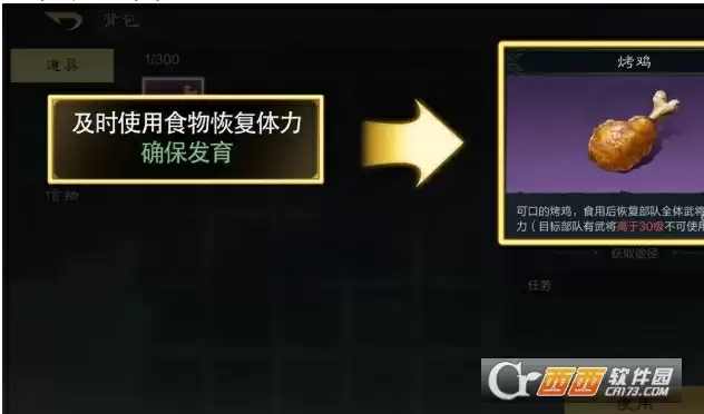 4、前期需要关注武将体力。30级前,可通过食物恢复体力。为确保武将等级后续提升,接近30级时需密切关注体力和经验值,及时使用食物恢复体力,确保发育。
