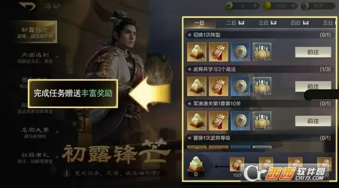 9、积极完成新手活动任务。在游戏中活动任务往往配有丰厚的奖励,建议主公时刻留意这些任务,并积极参与以完成它们,以获得更多的资源,加速主公的发展。