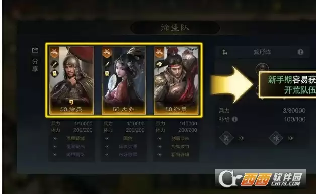 7、合理搭配武将以最大化战斗力。选择武将时需考虑属性、技能和特长。前期武将少时,推荐使用前期较易获得的徐盛+大乔+孙策的组合,保证前期战斗无忧。