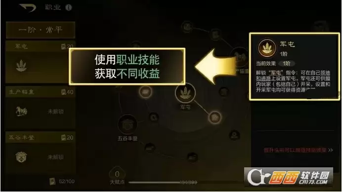 11、及时解锁与提升职业技能。使用职业技能,能够加快发育速度或为盟友提供关键的支持,因此,主公需多多通过讨贼,军演等方式获取职业经验,解锁更多职业技能。