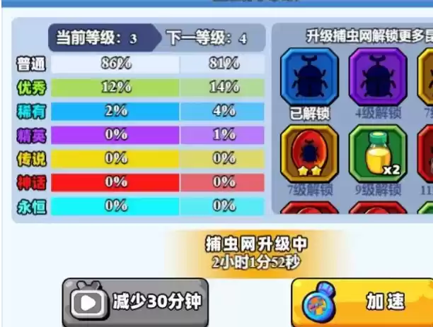 这里简单说明一下,每消耗1瓶捕虫液会获得一点捕虫熟练度,而【捕虫网】等级需要使用一定数量的【铃钱】提升。在【捕虫网】升级时,需要一定的时间,使用【秒表】可减少等待的时间