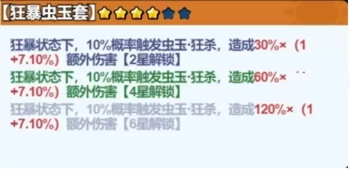 如下图,狂暴虫玉套的星级总数达到了四个,随机词条中狂暴虫玉伤害达到了7.10%(即所有的普通昆虫所累加的狂暴虫玉伤害达到了7.10%)则此时已激活前两个套装技能效果