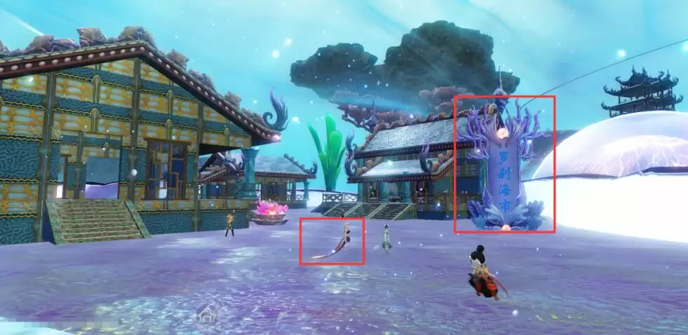 旅者点击主界面功能轮盘【传送-城镇-南海主城】抵达南海神宫后,视角面向南海神宫宫殿,从悬赏台右侧通道上去即可抵达【罗刹海市】,【鲛人婆婆】就在通道出口右侧,【罗刹海市】标牌前。靠近【鲛人婆婆】与之对话即可接取任务【海市遗孤】,跟随任务指引进行任务即可。