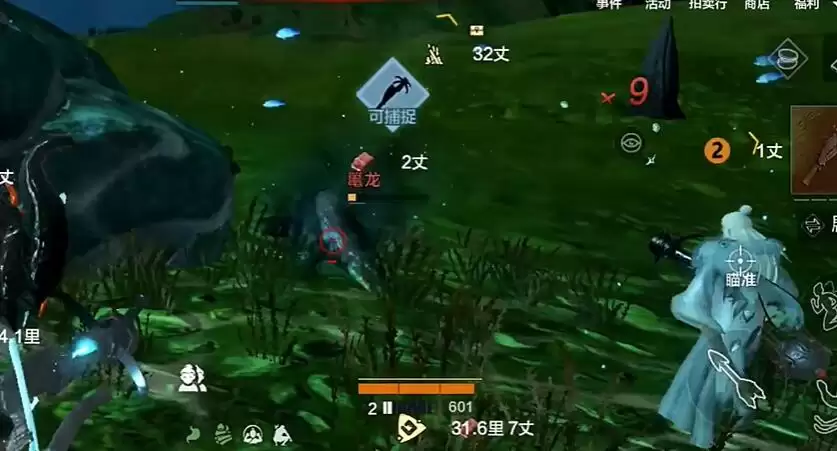 3、玩家只需要在西山附近的水域寻找淡水,潜入水下即可找到可捕捉的鼍龙了。